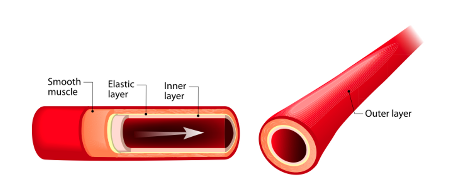 動脈とは、心臓から送り出される血液が初めに通る血管で、高い血圧に耐えるために壁が厚くなっております。
