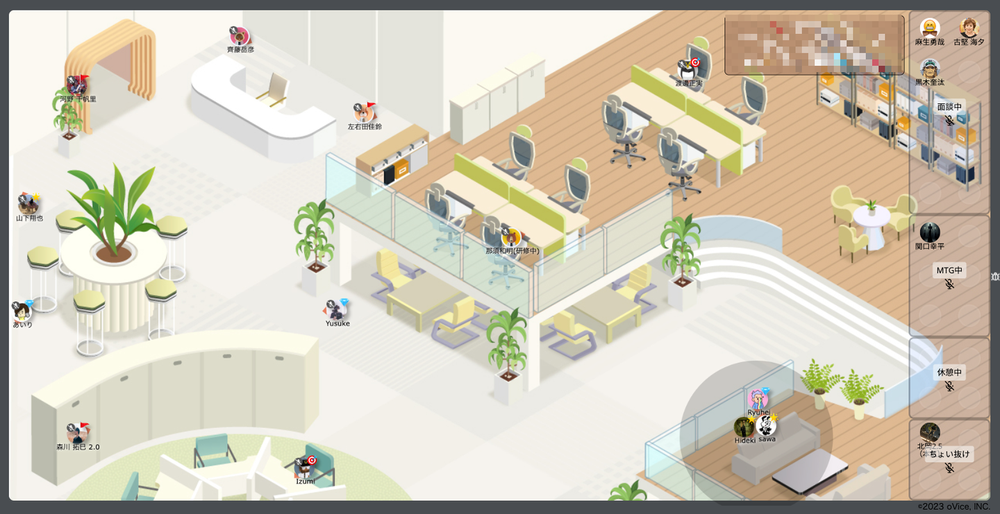 ↑ フルリモートでも気軽に会話できるよう、oViceという仮想オフィスツールを導入しています