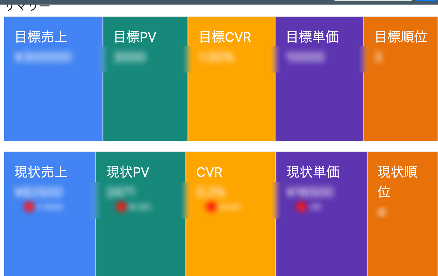 記事の月間PV・検索順位・現状&目標CVR・売り上げ・承認データ等もろもろの記事データを確認できる社内ツールです。このツールを使用して、改善幅のある記事を洗い出します。