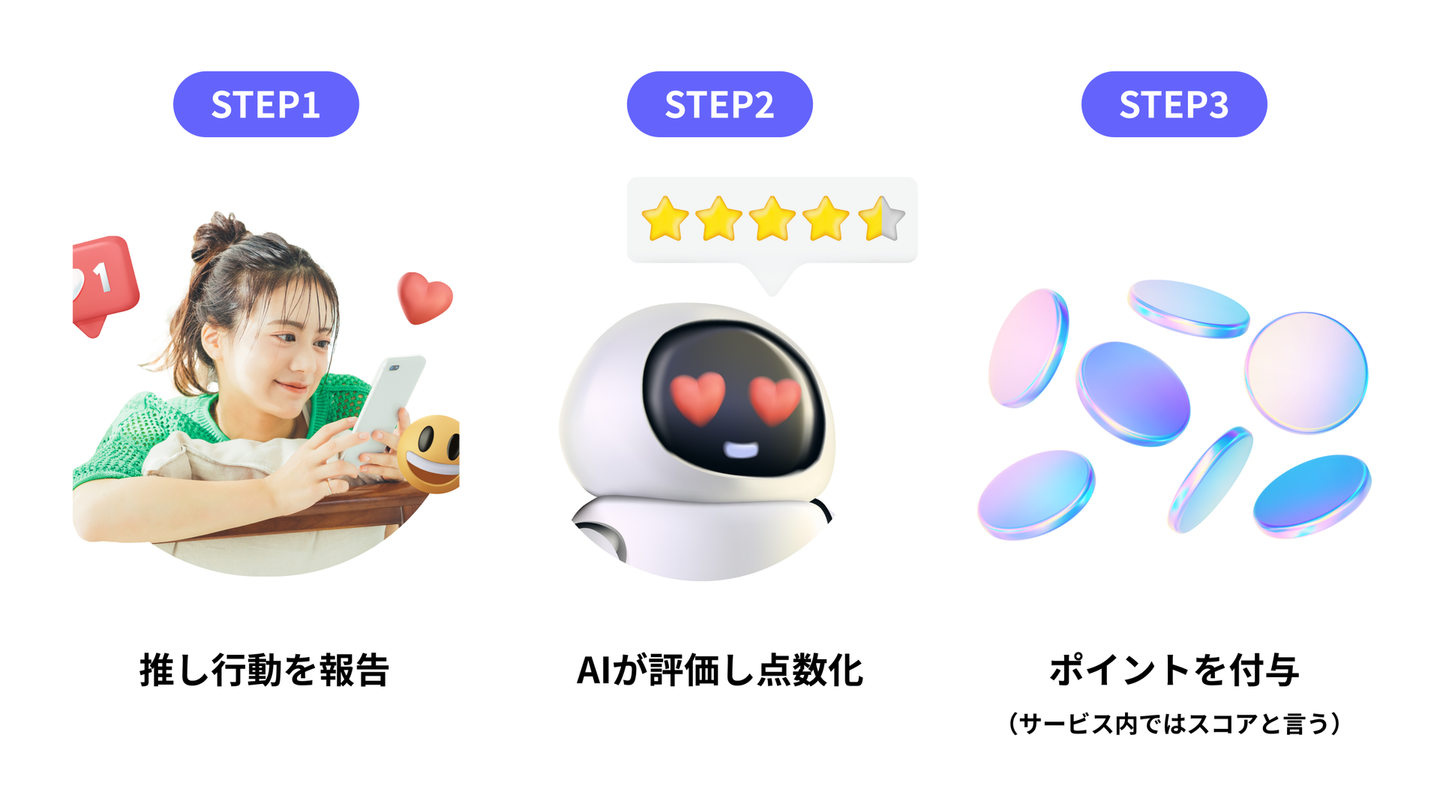 本手法は、企業が推し行動(商品・ブランドの応援につながる行動)を定義し、その行動の貢献度をAIが定性評価を含めて数値化し、貢献度に応じてスコア(ポイント、以下スコア)を付与する仕組みです。広告に依存せず、企業と顧客の関係性の中で成果を生み出す新しいマーケティング手法です。