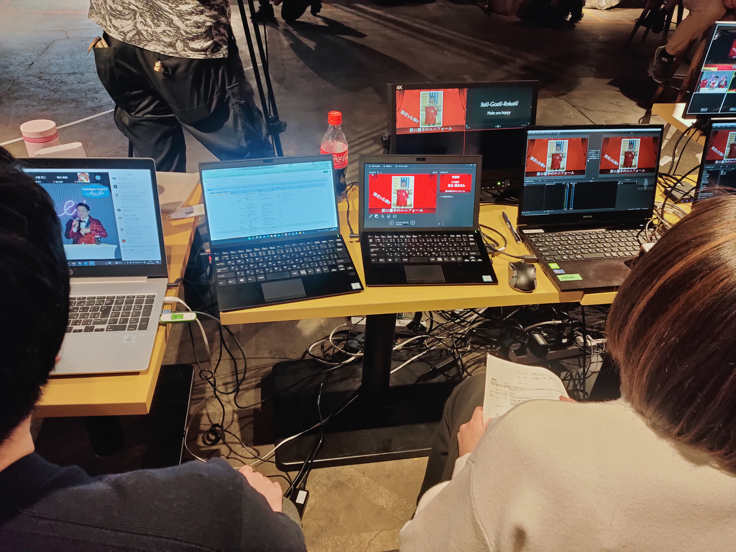 本番開始2時間前にリハーサルを開始。照明や通信状態などを細かくチェックしている運営メンバーは、10台以上のパソコンを使い裏でこのパーティーを支えてくれましたm(。。)m