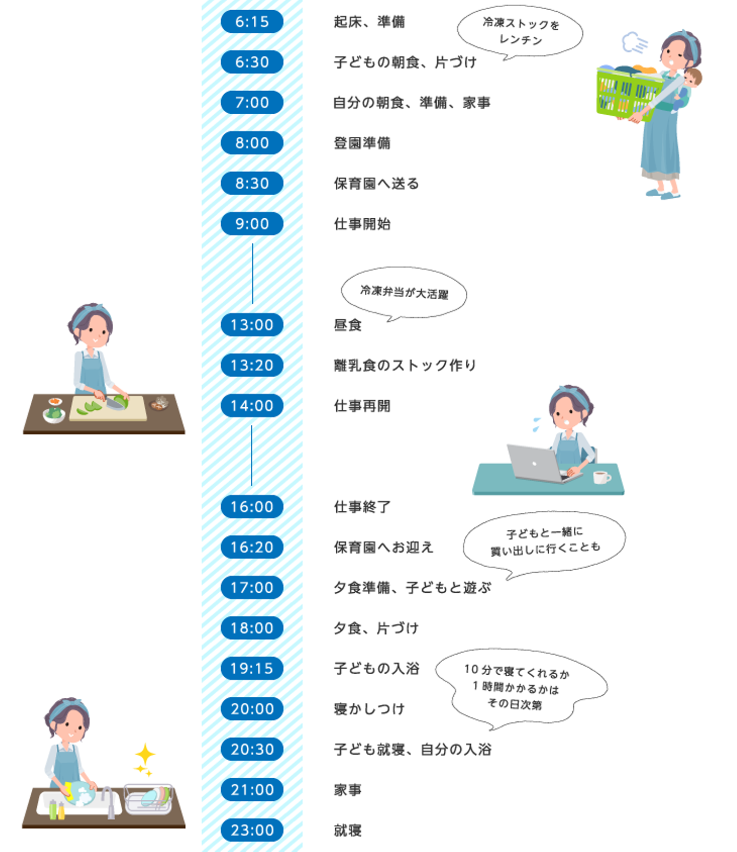 育休を終え仕事に復帰し、現在の勤務時間は9時~16時。時短勤務なのに正直ものすごく忙しいです。育児本に載っているような「先輩パパママの1日のスケジュール」を見ると、18時に仕事を終え18時半に保育園へお迎えに行き、19時に夕食、19時半にお風呂、20時に寝かしつけ…といった例もありますが、そんなパーフェクトに回ることってあります?我が家は無理です。