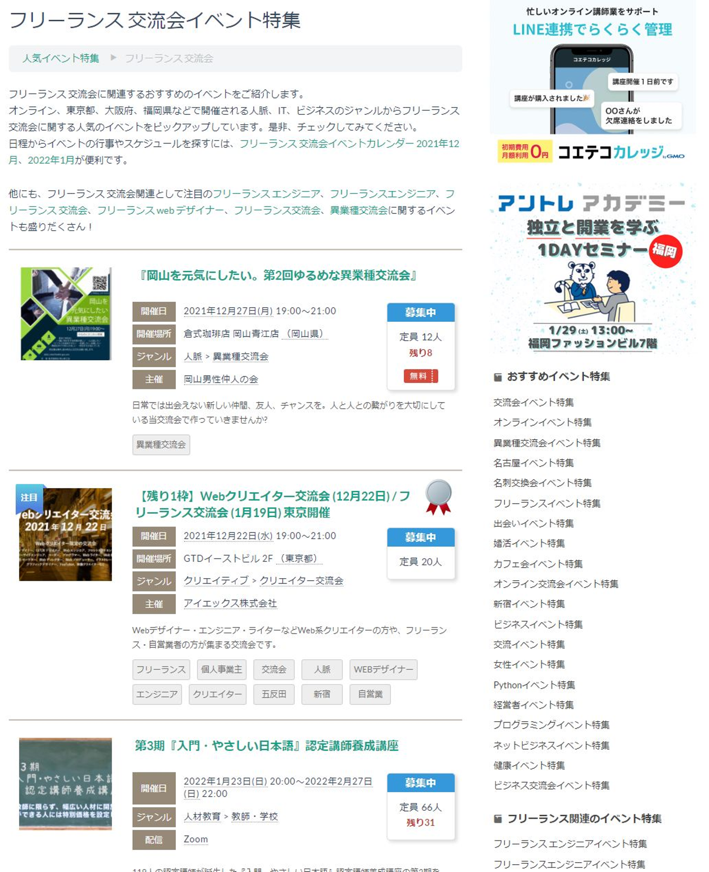 こくちーずプロ フリーランス 交流会イベント特集