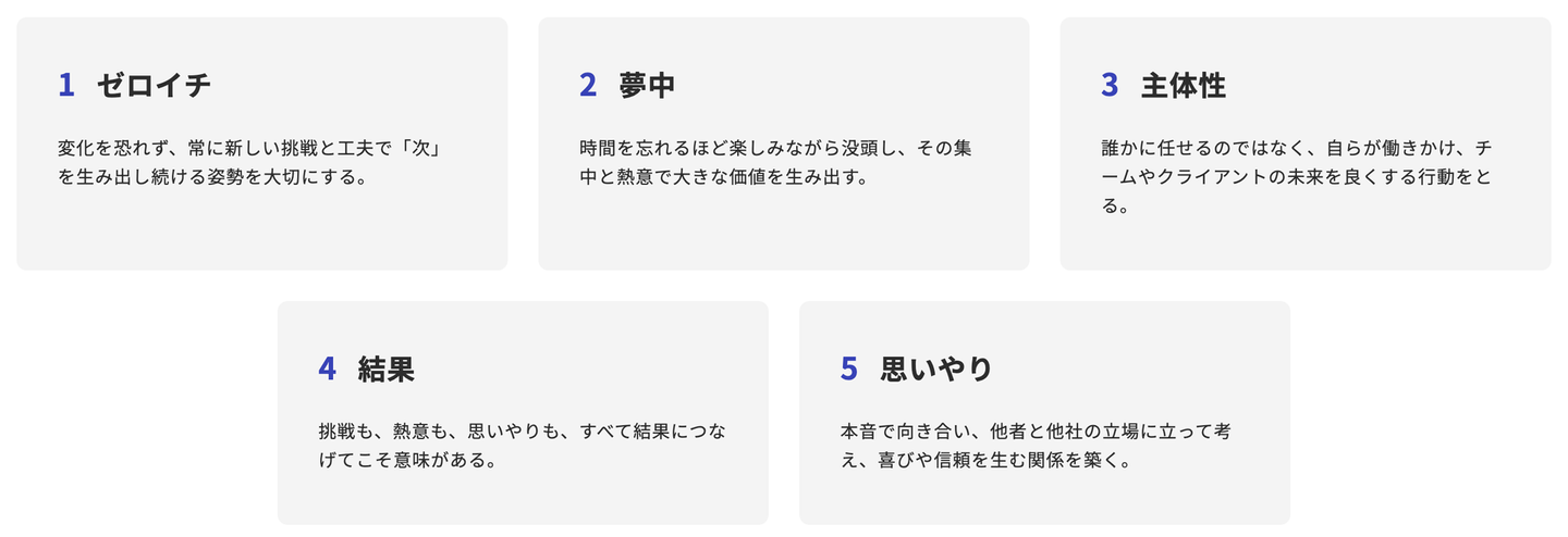 自分たちで考えたバリューだからこそ、この5つの言葉を行動指針にして日々業務に邁進できています。