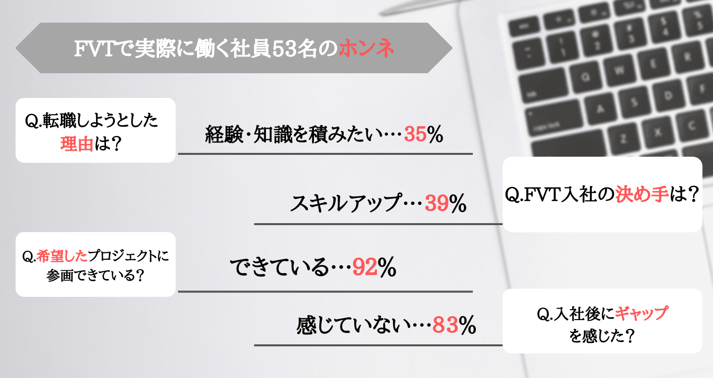 「エンジニアに寄り添う」FVTのビジョンに関して、実際に働く社員の本音について迫りたいと思います。具体的には、先日実施した社員53名を対象にした社内アンケート結果を公開します!