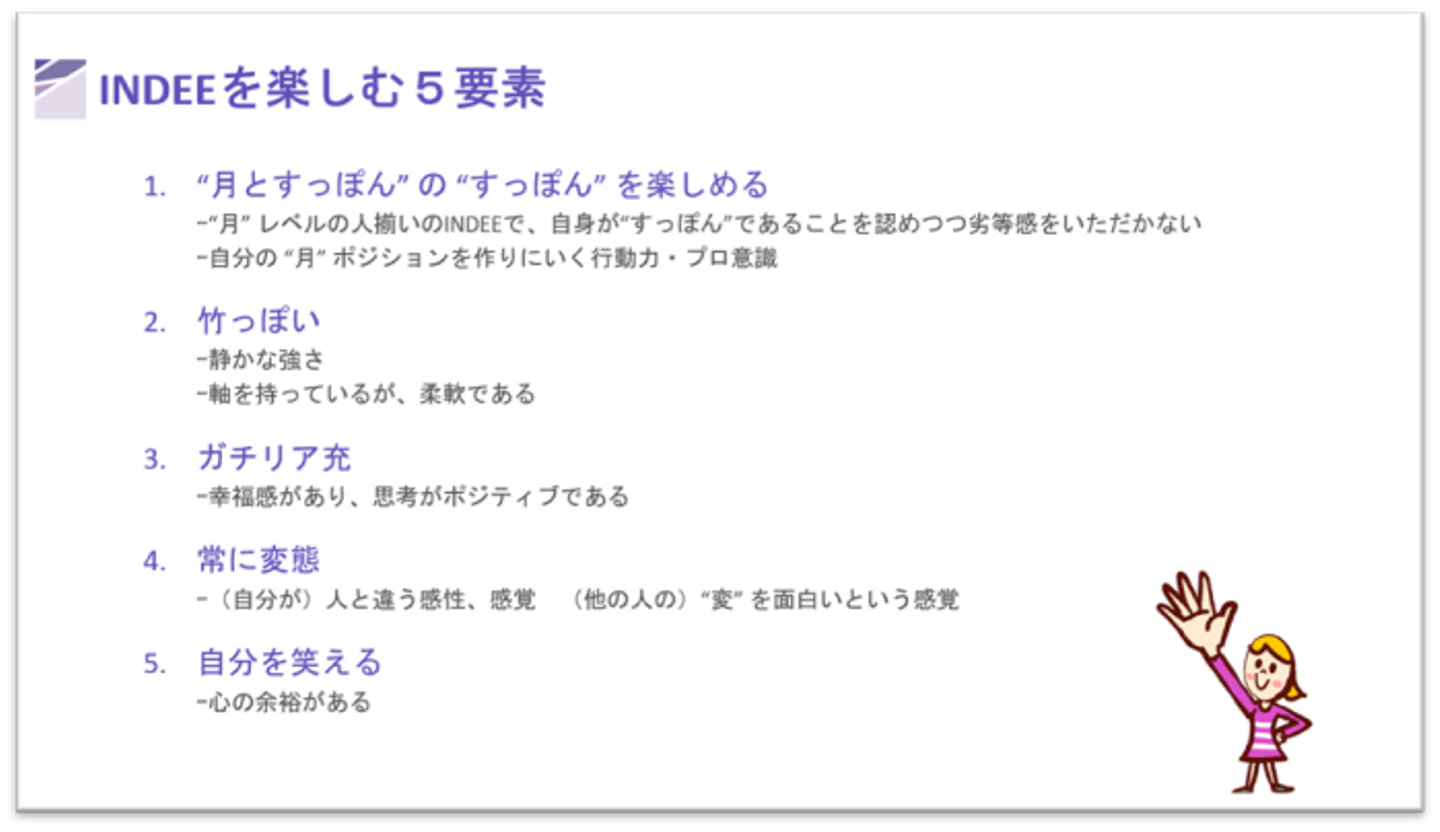 せっかく一緒に働くなら、INDEEを楽しんでほしい!という思いから、INDEEを楽しむ(=活躍できる)5要素を整理しました。