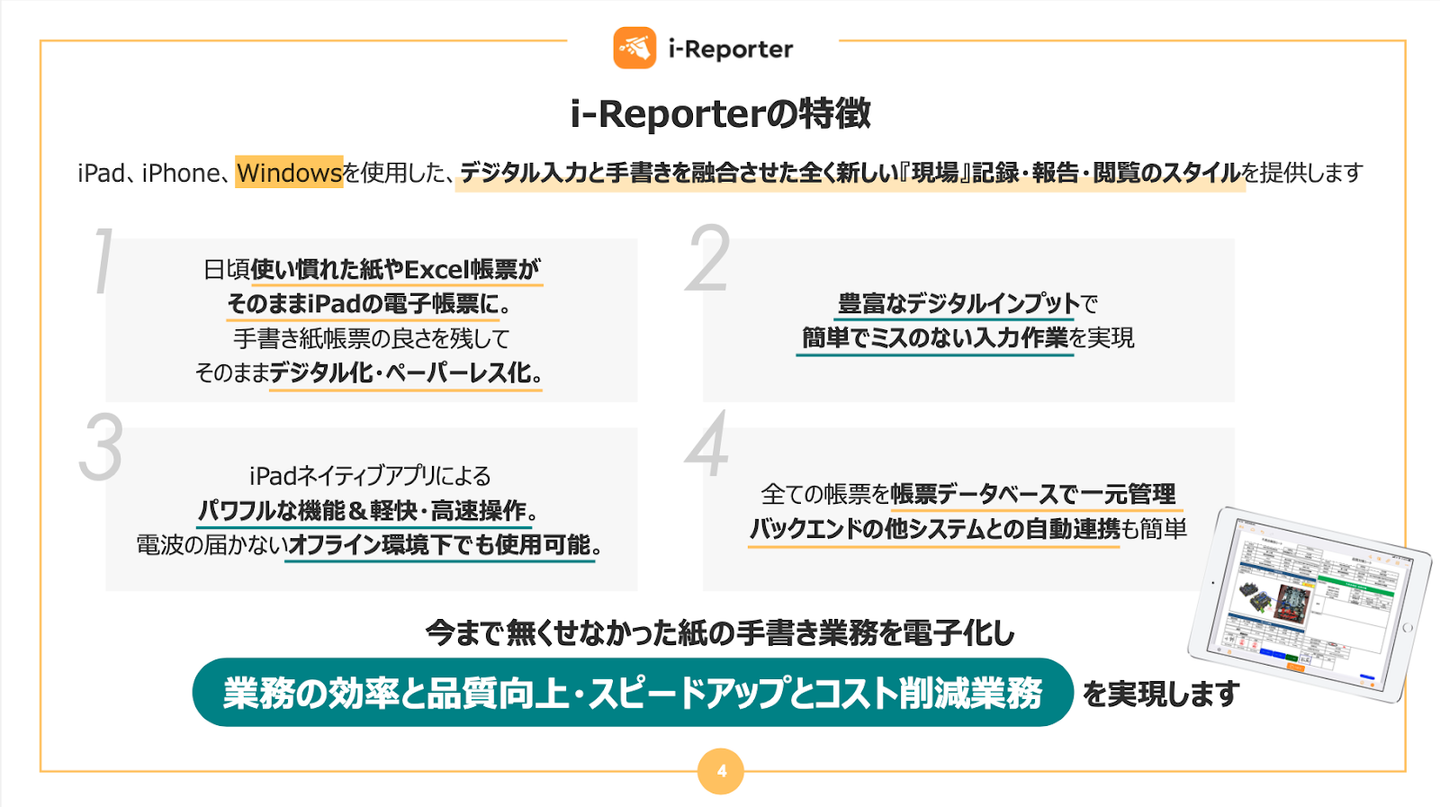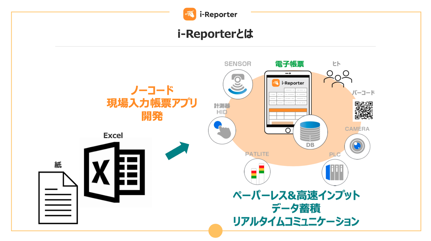i-Reporterは、あらゆる仕事現場にある紙の報告書をペーパーレスにするためのツールで、電子帳票業界でトップのシェアを誇っています。