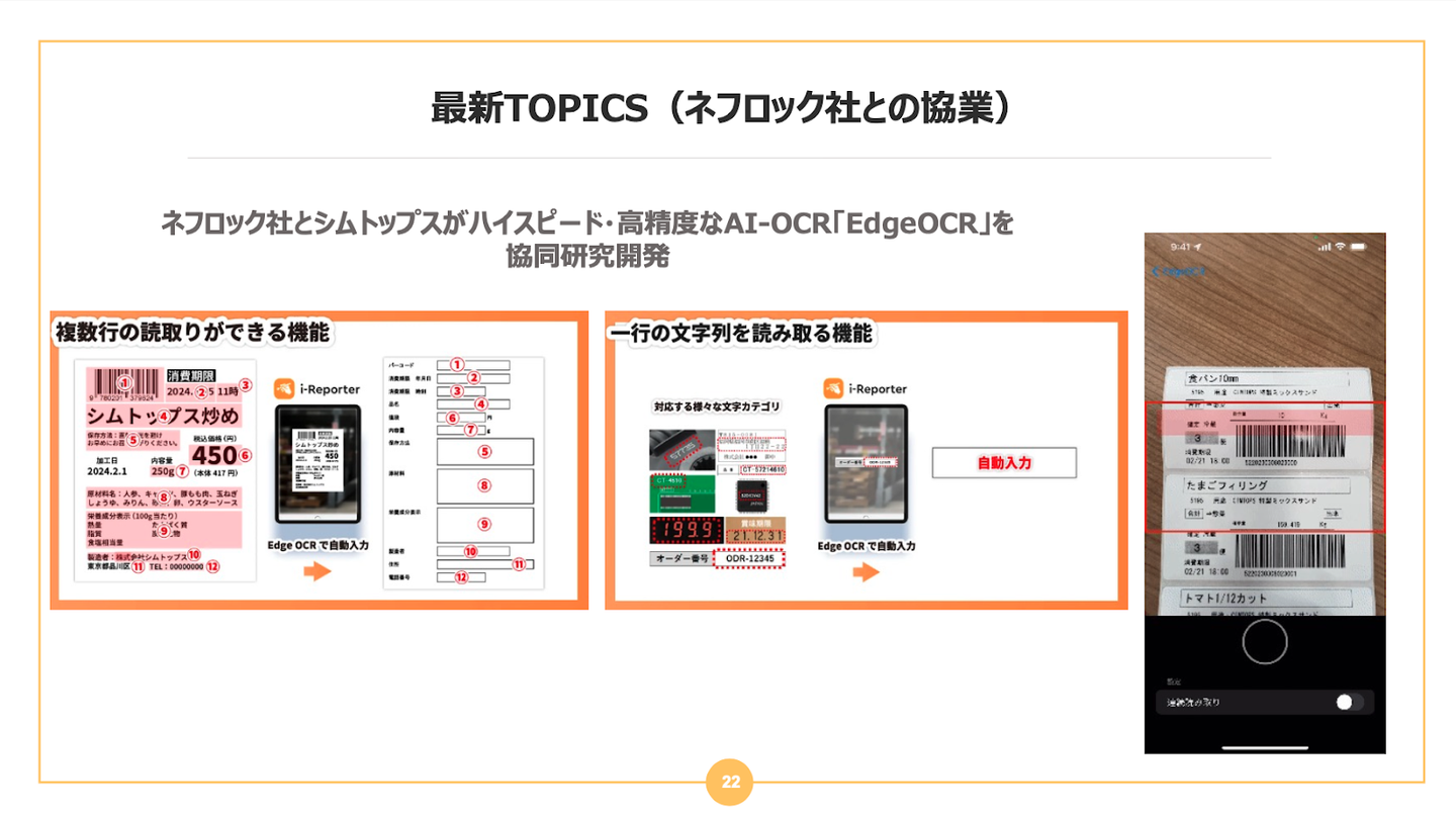 たとえば、Chat GPTと連携することで、取引先や国の機関などに提出する報告書を自動的に生成できるようにしたり、エッジAI-OCRを使うことで、従来のOCRでは対応できなかった加工品に刻まれた文字を読み込めるようにしたり、といったことが挙げられます。