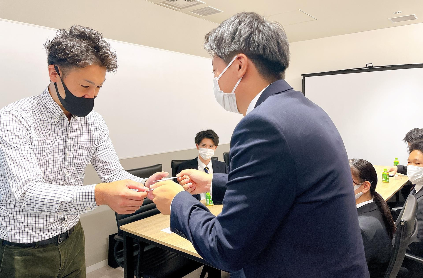 初名刺の記念に専務と名刺交換の練習を実施しました!