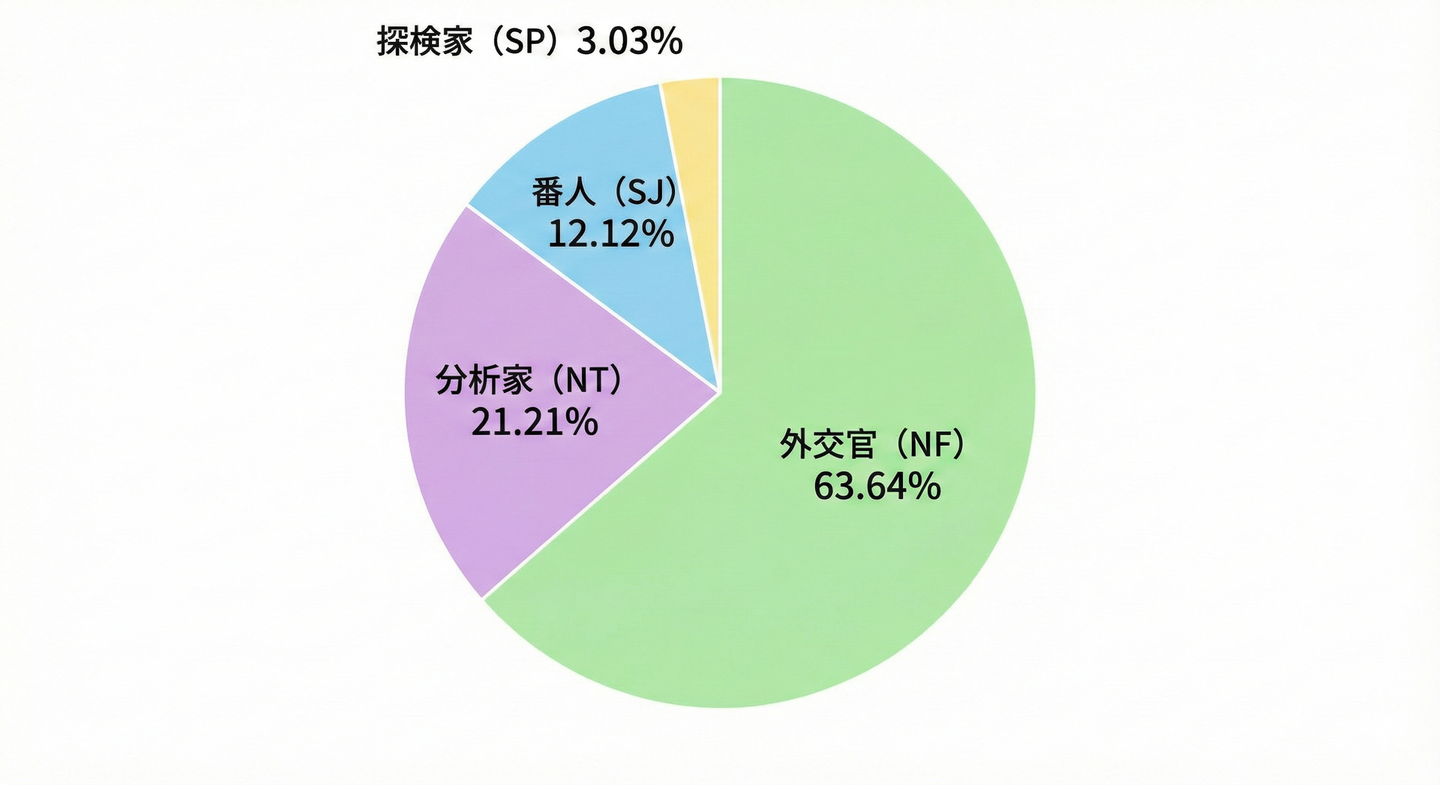 なんと「外交官 (NF) グループ」が全体の3分の2近く(63.63%)を占めていることがわかりました!