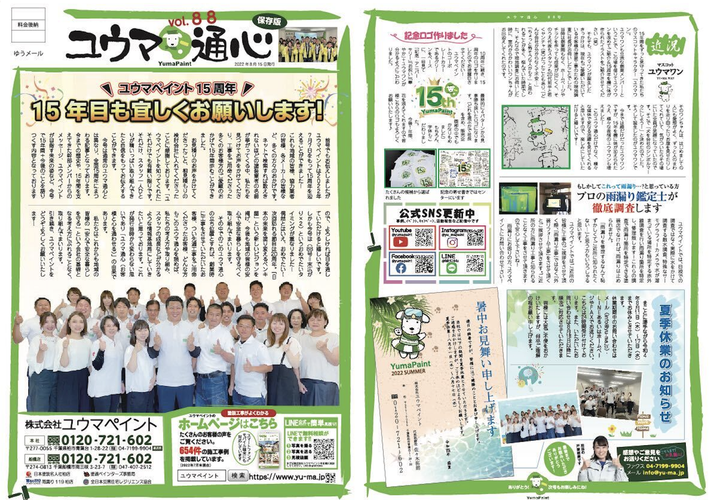 ユウマペイントでは、1度でも問い合わせや見積もり依頼、工事依頼をしてくださったお客様に対して「ユウマ通心」という冊子を年に4〜6回送っています。今回は15周年を迎えることができた感謝を伝えるために作成した「ユウマ通心」の内容についてご紹介します。