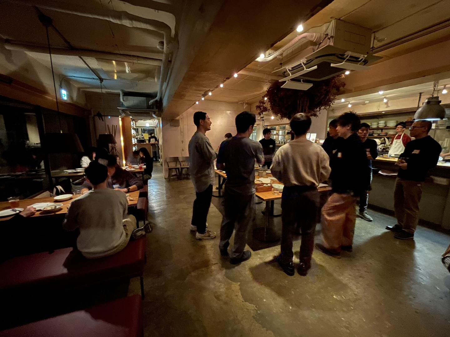 お店の奥に進むと…社長の橋本さんを初めとし、MELONメンバーの皆さんがが思い思いに過ごされていました。立食形式の食事はコミュニケーションが取りやすく、話も弾むようです!