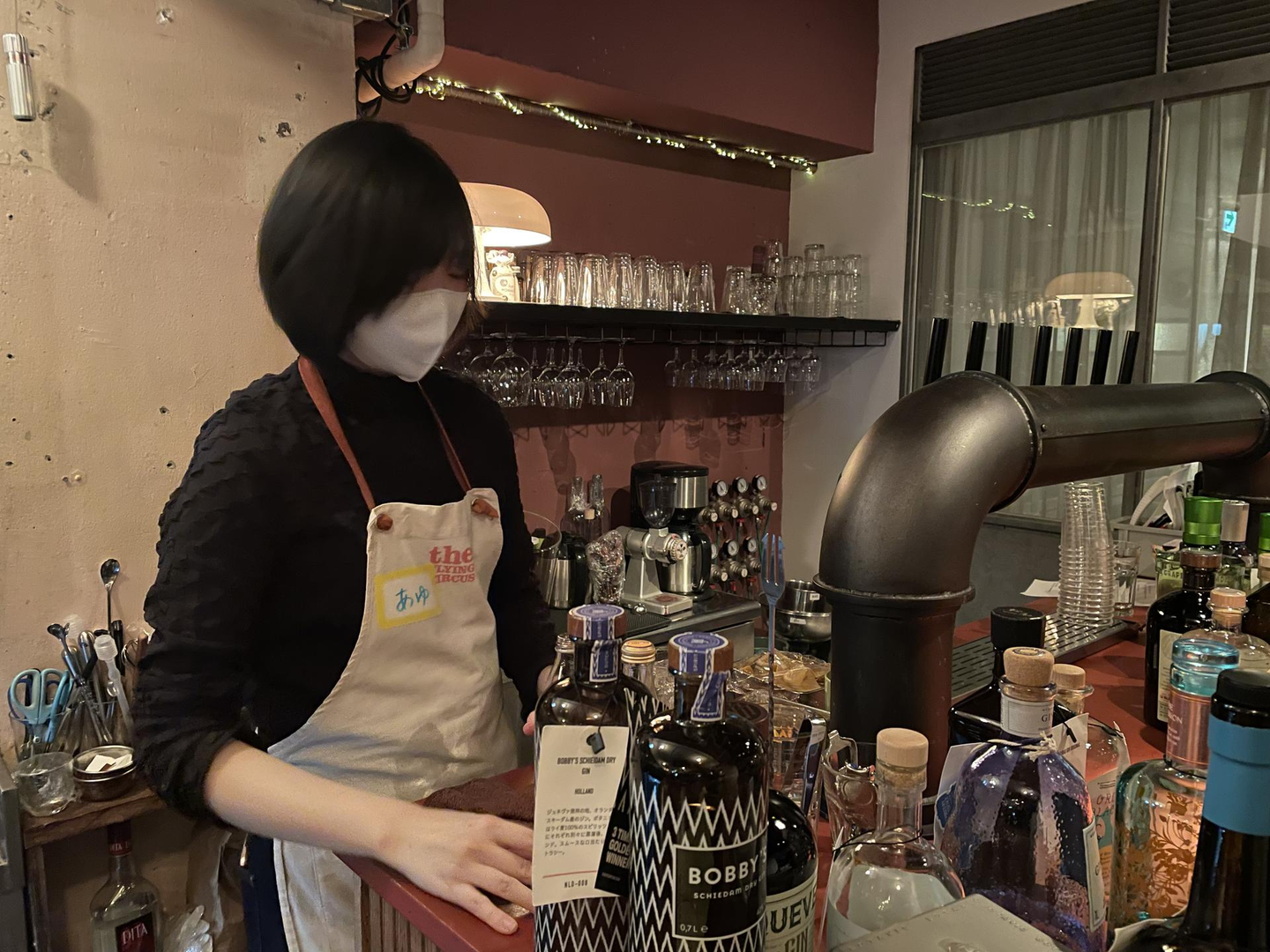 美味しい料理のお供はやっぱりお酒!コップを持ってバーカウンターに行ってみると、店員さんが手早くお酒を作ってくれました。カッコイイです…