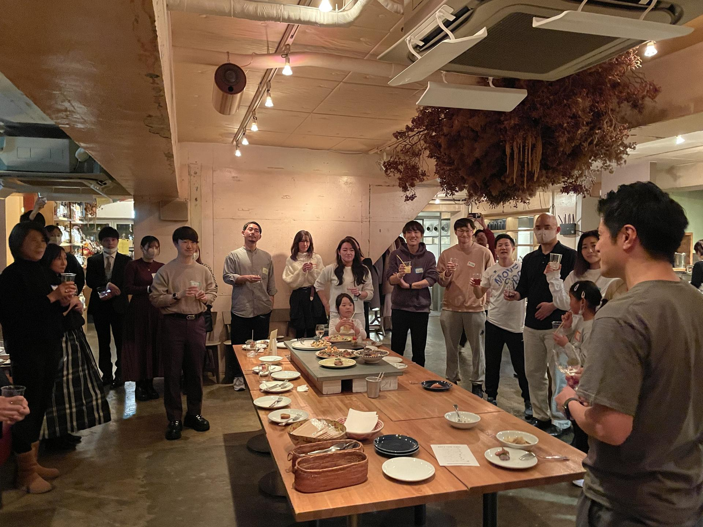 皆さんとお話しながら楽しく過ごしていると、橋本さんから集合がかかりました。「来年は飛躍の年にしていきたい」というお話があり、それぞれが決意を新たにしたところで乾杯!