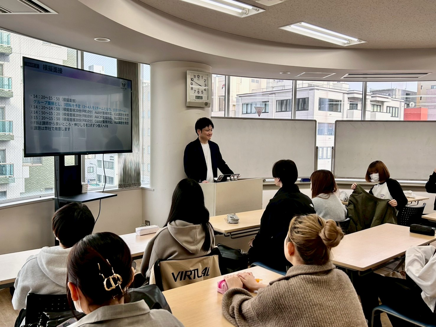 模擬面接講義は弊社が美容学校へ出向き、美容学生さんに対し実際の就職活動に近い臨場感を体験し、面接の雰囲気に慣れていただくという目的で開催しました。