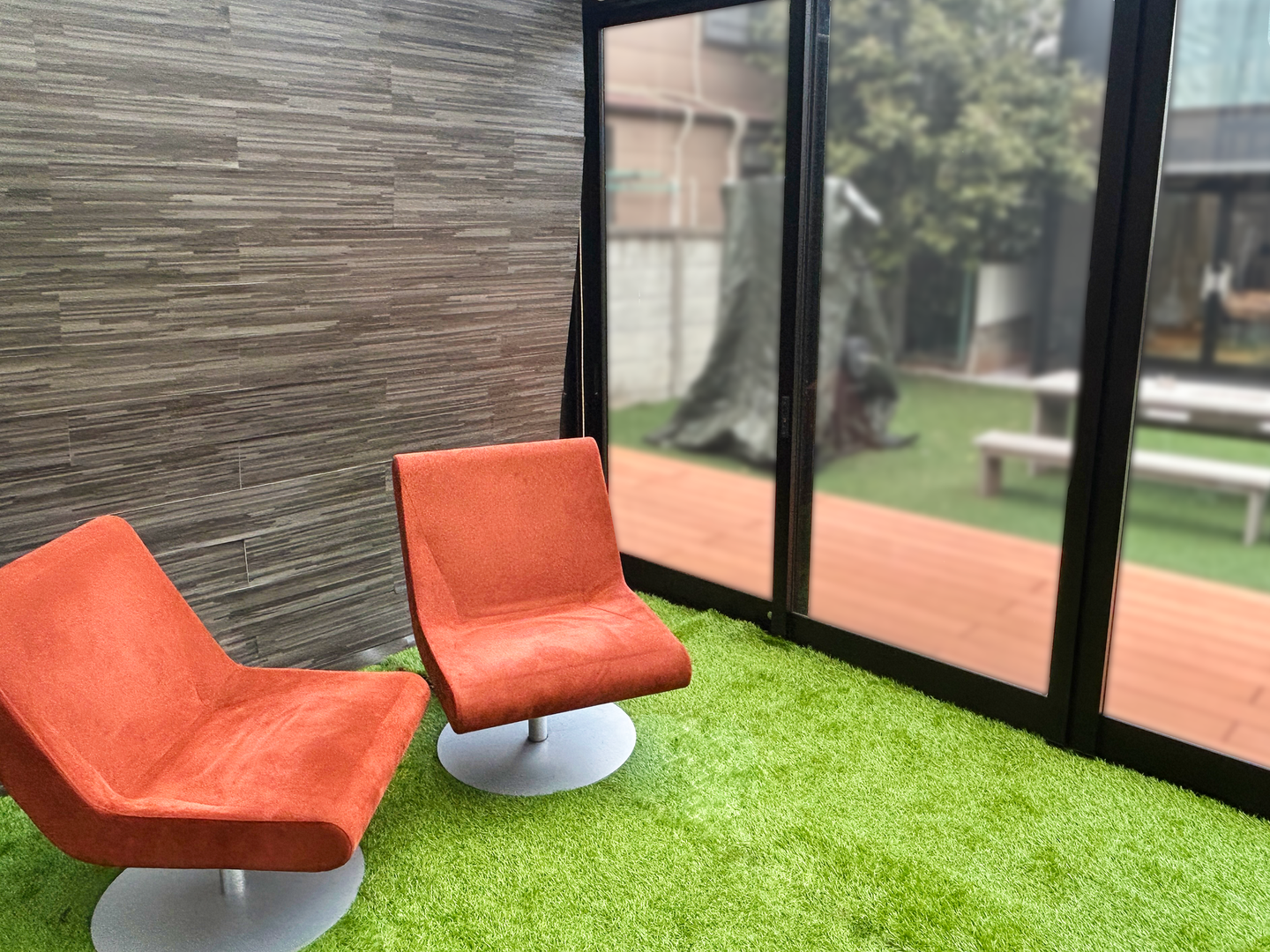 閑静な住宅街に位置しており、かつての一軒家をリノベーションして建てられた2棟の建物が特徴です。 両棟の間には広々とした芝生の庭が広がり、自然に囲まれた落ち着いた空間でリフレッシュすることができちゃいます!