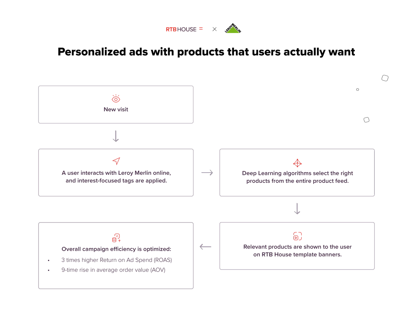 However, this is just the beginning. In the past, a simple approach like this worked. Today’s market is so competitive that all serious retargeting partners, including RTB House, leverage technology to streamline this process. For example, Deep Learning algorithms can determine more precise insights about a specific user’s preferences; for example, it might realize that the user is only looking at Adidas brands, and this gives you the opportunity to show the best Adidas sneakers and upsell that user with other Adidas sports products.