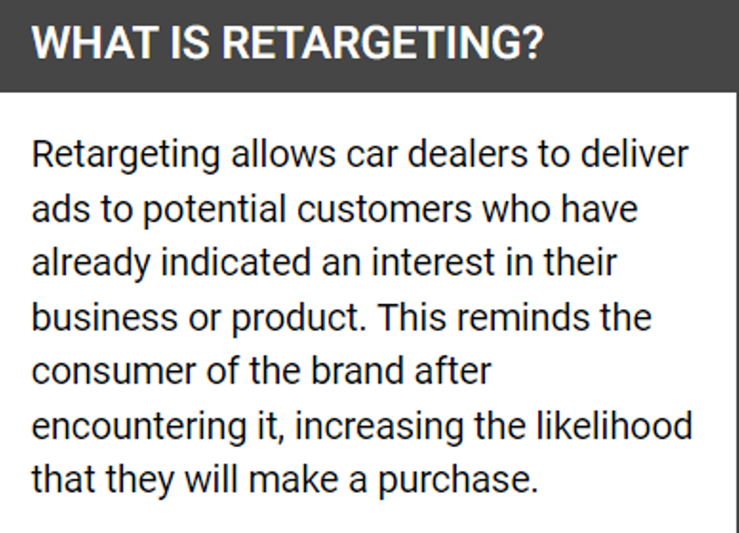 To capitalize on this opportunity, automotive companies should deploy tailored campaigns based on users' online behavior, such as visiting specific vehicle pages, downloading brochures or requesting quotes.
