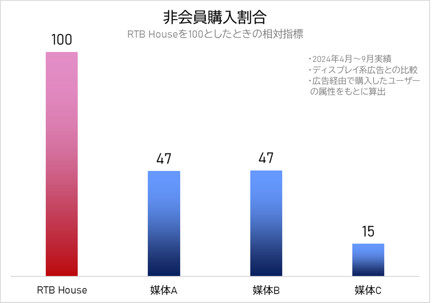 小島氏:RTB Houseの広告配信開始後から数カ月で他の広告プラットフォームとの明確な差が出てきました。驚いたのは、購入者全体の中に非会員が占める割合の大きさです。他の広告プラットフォームの2倍以上大きかったのです。非会員獲得を主な目的とはしていたものの、ちょっとうまく出来過ぎなのではないか、という印象でした。