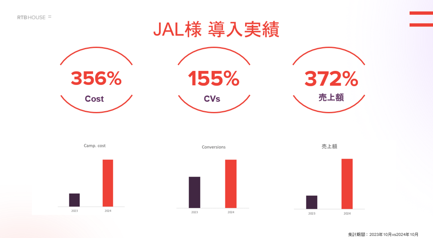 加藤氏:RTB Houseのタグを広告主様のウェブサイトに設置いただいています。今回のJAL様の案件に関しては、非会員を主な対象とするため、タグによる学習対象ユーザーのコントロールを行っていただいておりました。