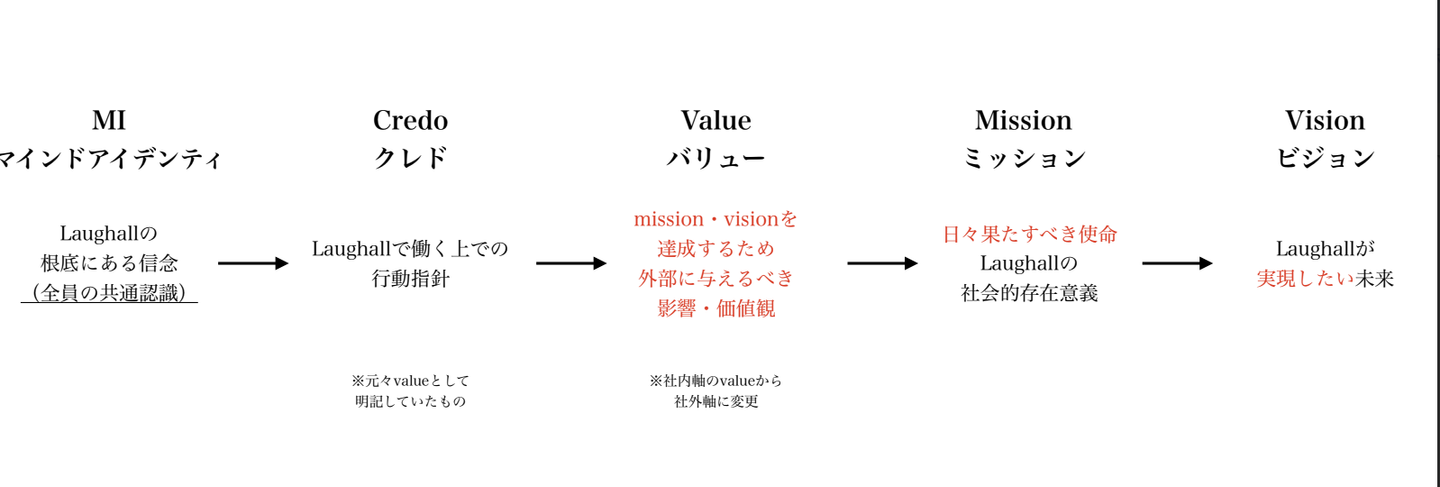 これこそLaughallの根底にある揺るぎない信念であり、私たちらしさ。全員に持ってほしい共通認識です。私たちが何のために存在しているのか、どこに向かって活動しているのか、日々どういったことを心がけるべきなのかを、MIとして定義しました。