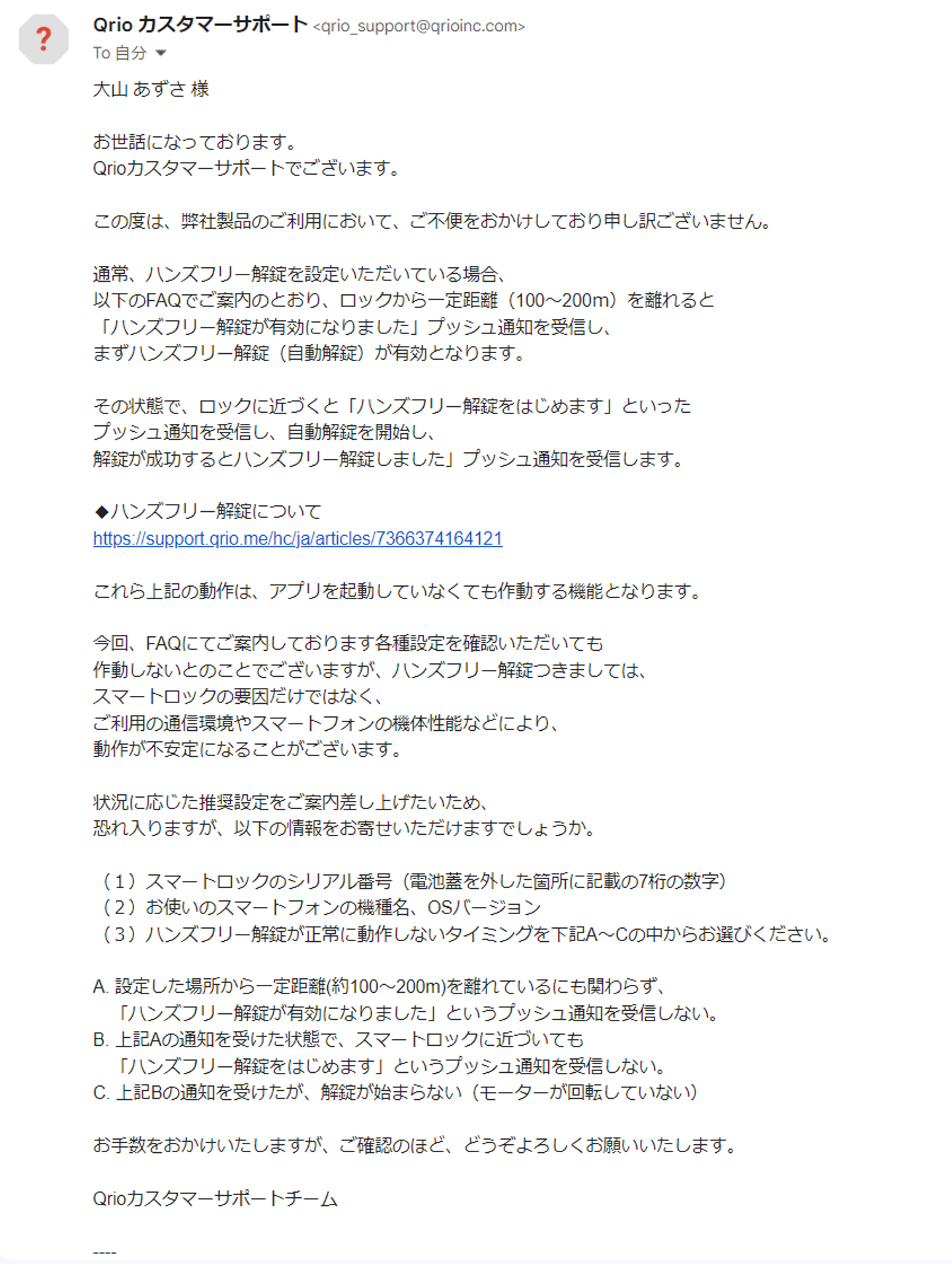 そこでメールで問い合わせてみたところ、1営業日以内に回答があり、あらゆる可能性を提示いただけました。ハンズフリー解錠は、推奨されているスマホの設定をきちんと完了させることと、自宅から離れる距離の判定が決め手で、無事に解決しました。