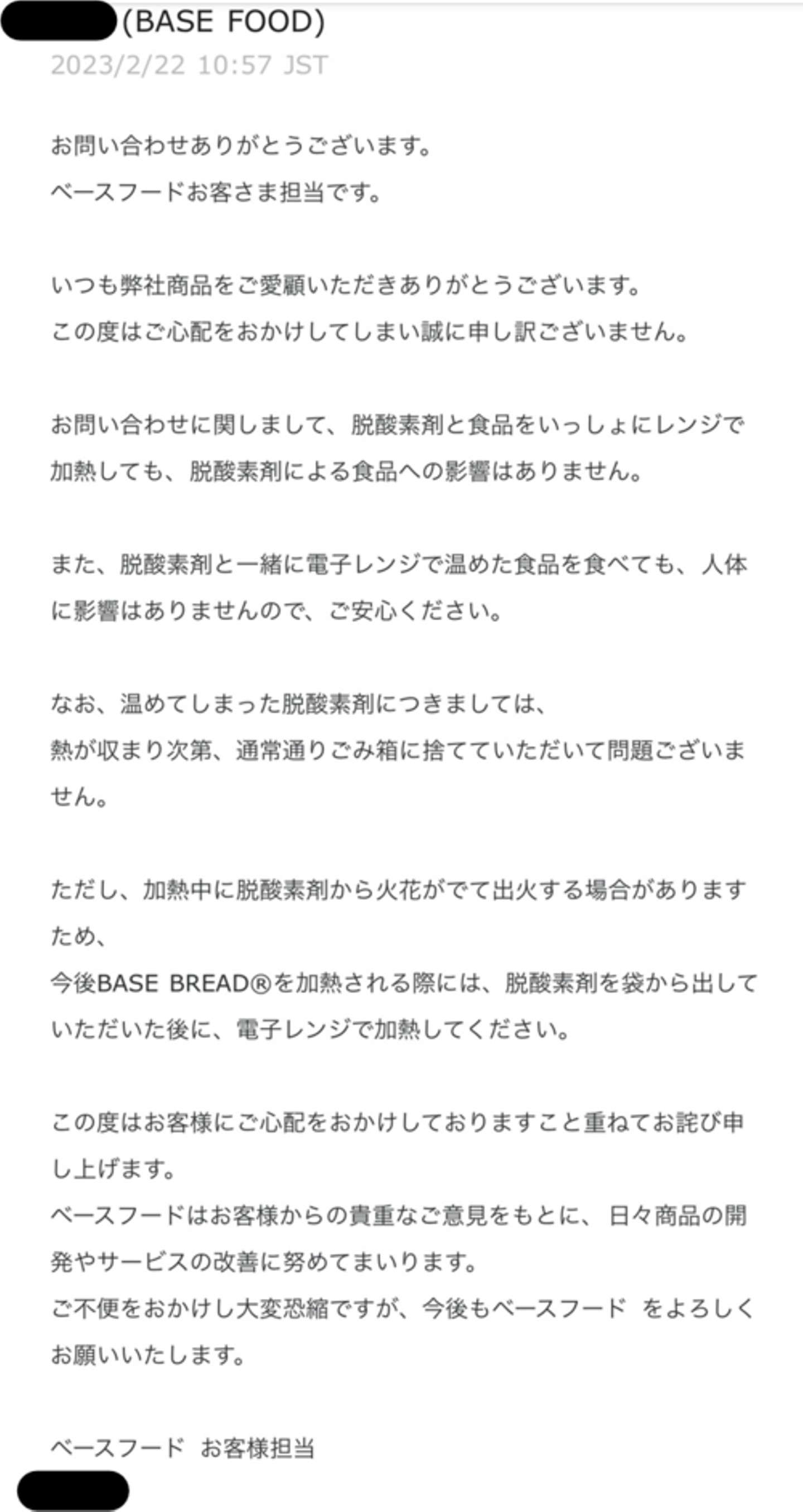 化学反応が起きるリスクや、加熱された脱酸素剤が破裂してしまう可能性がないかと不安になり、すぐにカスタマーサポートへ問い合わせをしました。翌日には返信をいただけたので、とても安心しました。