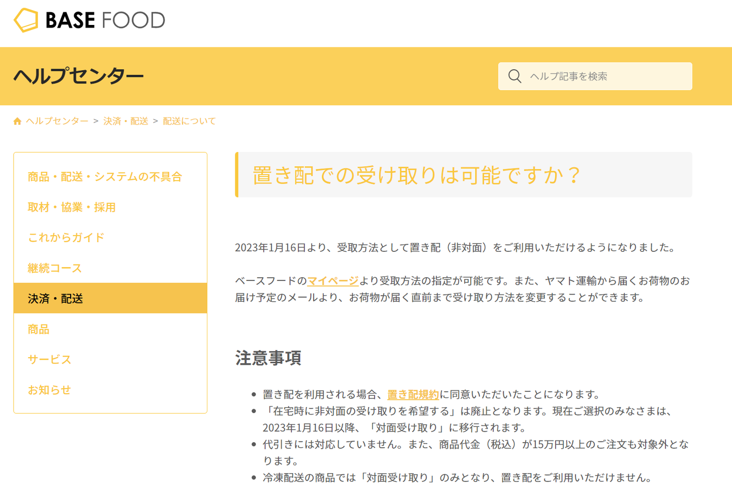 特にヘルプセンターは、BASE BREADに含まれる栄養素や原材料といった商品詳細から、置き配の指定箇所などの配送情報まで、多岐にわたる情報が カテゴリーごとに、コンパクトにまとまっていてとても見やすいです。