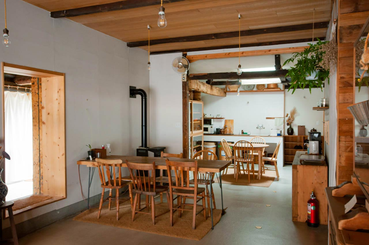 SARUYAを作っていくとき、できるだけ、既存のものを活かそうと話し合って決めた。そのままだと、汚く見えるかもしれない。構造は変えずに、要所要所に既存の梁を見せたり、壁を残してみたり、耐震との兼ね合いも難しかった。例えば、窓も見る人に大きな印象を与える要素という事もやりながら理解した。できるだけ、建具職人の技術が見えるサッシを使った。あと、防寒の為に木サッシを二重に使う事や、アルミサッシと木サッシを二重に使う事がこの地方の気候には合うんだなと、機屋工場に見学した時に気がついた。なので、数年後に二重にすることになった。地域の人たちが、家を解体する時に時々呼んでくれた。そこで、もらった木サッシを使用したり、もらってきたテーブルなどもきれいにして、今お客さんが仕事できるようにSARUYAのロビーに並べている。食器棚も近くの大星さん(LONGTEMPS)からもらったものを直して使っている。
