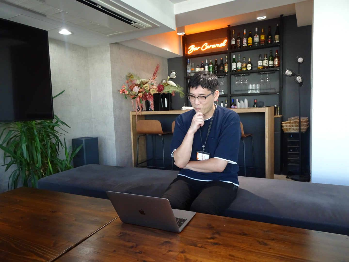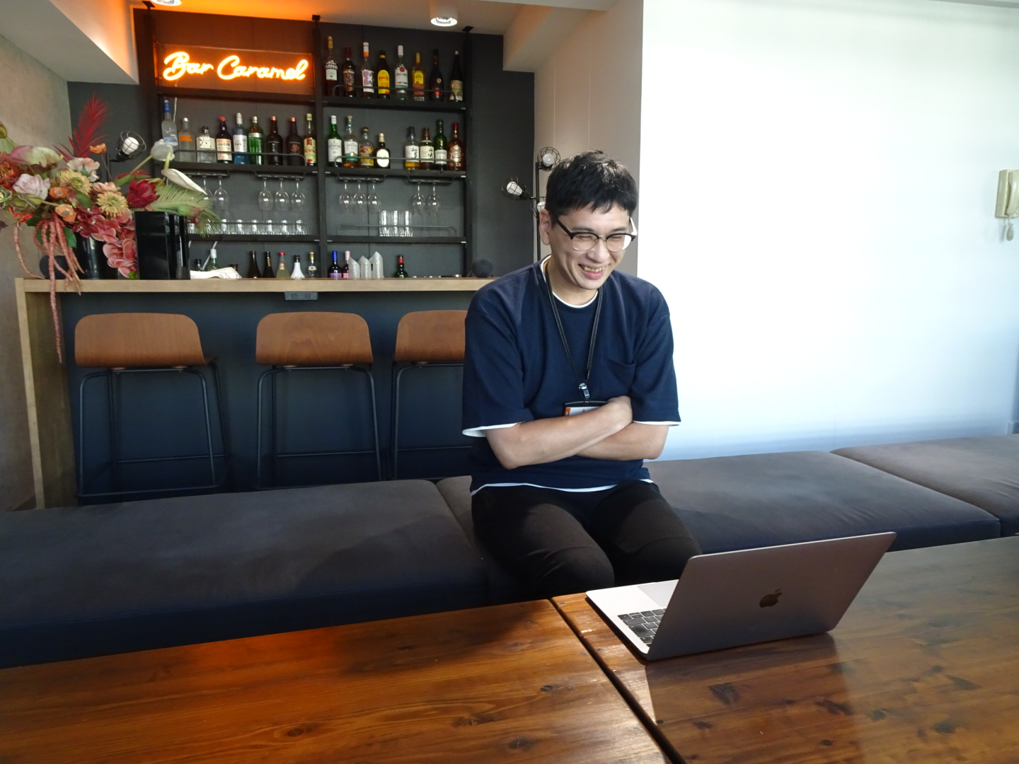 コミュニケーションをとても大切にしている会社なので、社員同士でランチに行くとランチ手当が出ます。あと、BARがある会議室で定期的に交流会が開催されて、社員全員でゲームなどをして盛り上がったりしています。「BAR CARAMEL」のネオンが素敵です!