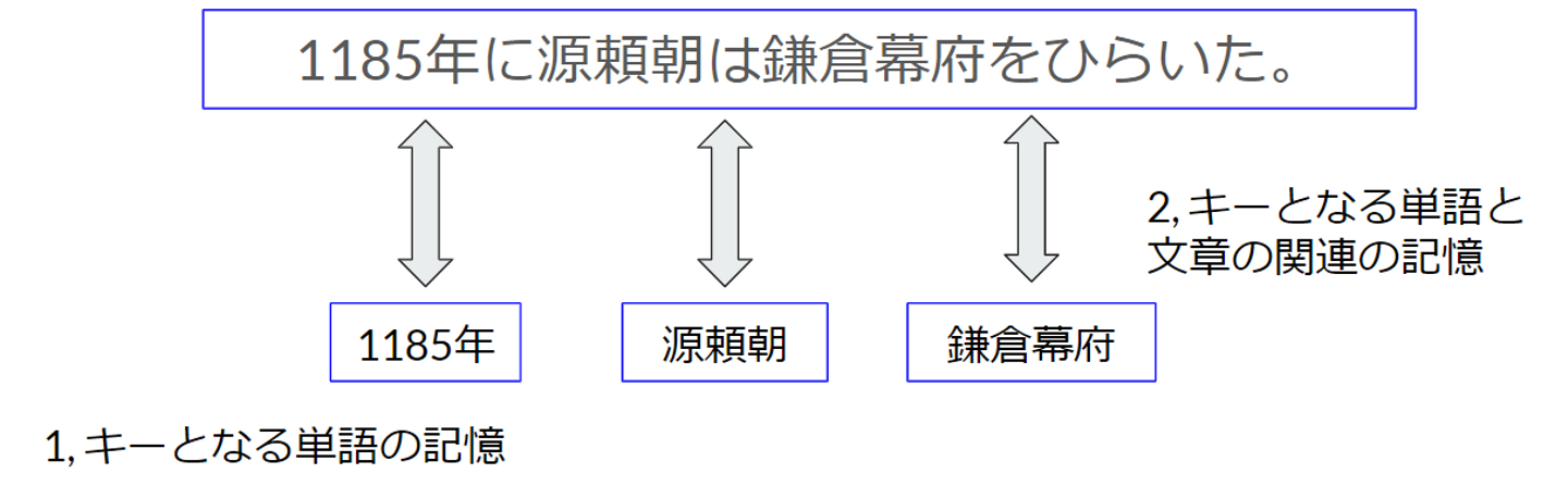 Bookのコンテンツとしては、”apple” <-> “りんご”のようなフラッシュカードタイプのものや、”1185年に源頼朝は鎌倉幕府をひらいた”といった文章形式のものが存在します。 フラッシュカードタイプの”apple” <-> “りんご”の場合は単純で、そのエッジの記憶情報をそのままコンテンツの記憶度として利用します(計算法は後述)。”1185年に源頼朝は鎌倉幕府をひらいた”のような文章の場合は、まず、文中の重要なキーワードを抽出します。そのキーワードをノードとしたときの記憶情報(1)と、キーワードと文章の関連の記憶情報(2)を複合して記憶度を計算します。Monoxerは文章を入力するだけで適切なキーワードを抽出し、コンテンツを作成してくれる機能を備えているので、このための作業は完全に自動で行うことができます。
