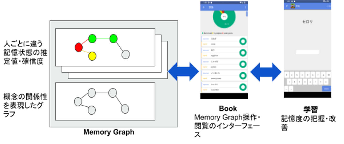 Memory Graphは基本的な概念間の関連性を表現したグラフとそのグラフ内のノード・エッジに対する個人個人の記憶情報をまとめたものです。それぞれのノードは種別(単語・画像・手書きなど)、言語、文字列の3つの要素をもっており、それらが同じものは同一のノードとして扱われます。