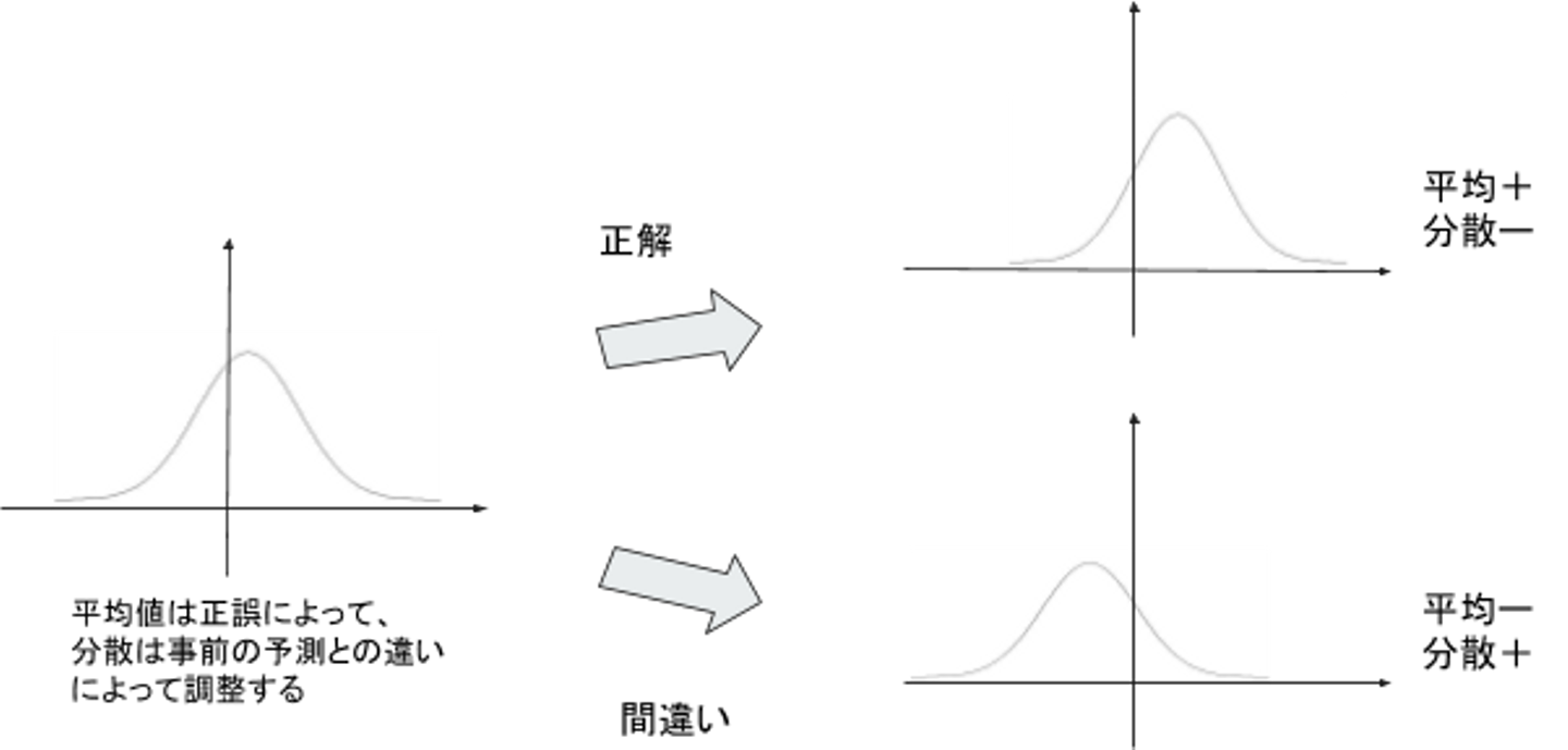 ノード・エッジの記憶情報としては記憶度合いと確信度を持っています。記憶度合いと平均確信度を標準偏差とした正規分布で記憶状況を表現し、[0, ∞]の積分値が記憶度となります。記憶度合いは記憶度算出のための便宜的なもので、その値自体に意味はありません。学習時には記憶度から問題の正誤を予測し、実際の正誤で記憶度合いを調整、予想との一致不一致で確信度を調整します。