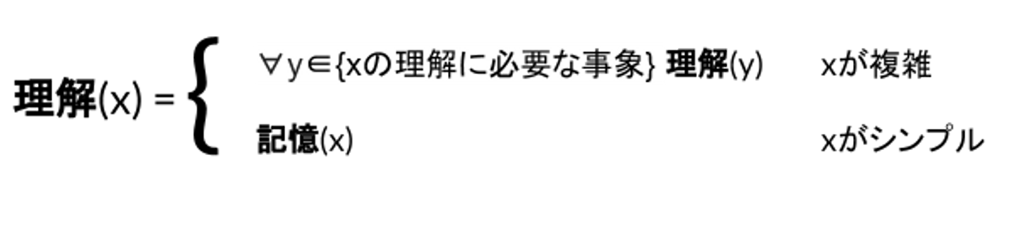 私たちは理解と記憶は本質的には同じものであると考えています。具体的には、あるものXに対する理解とは、Xの理解に必要なすべての事象に対する理解、あるいは、Xの記憶である、と再帰的に理解を定義できるのではないかと考えています。