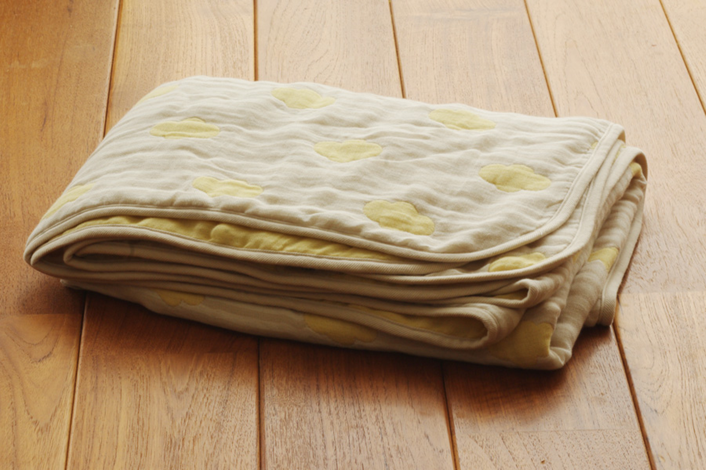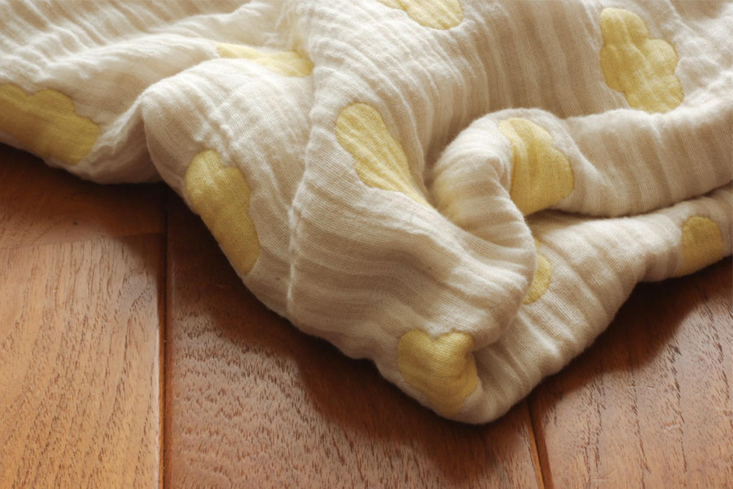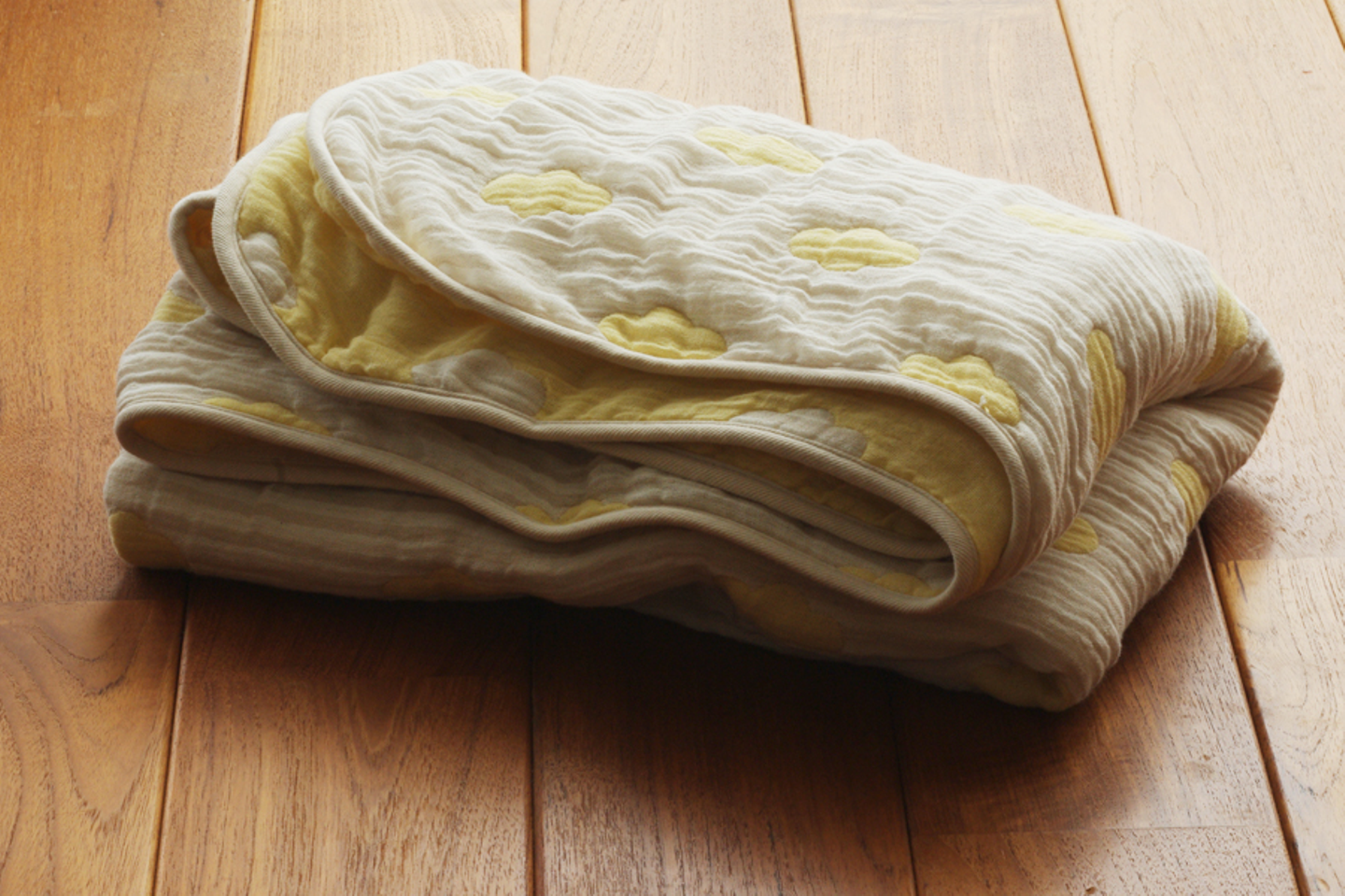 6重のガーゼが纏う空気が層になり体温を柔らかく留めます。6枚重なった一番内側の生地は太くて粗い折り目に織られ、よりふっくらと空気を取り込むことが出来るのです。夏場のエアコン下ではベールのように体を優しく包んでくれるし、肌沿いがいいので季節の変わり目には毛布のように使うのもありです。
