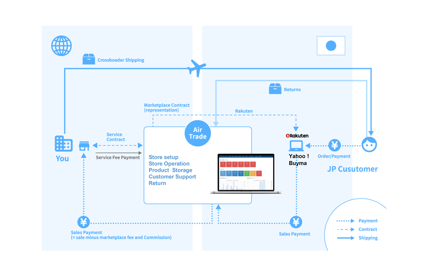 Air Tradeは日本国内でECビジネスを展開したい海外企業に向けた、 ECモールへの出店サポート事業を提供しています。 提供しているサービスは幅広く、各モールとのやり取りや、日本のカスタマーサポート、広告表現の規制チェックなど を提供しています。