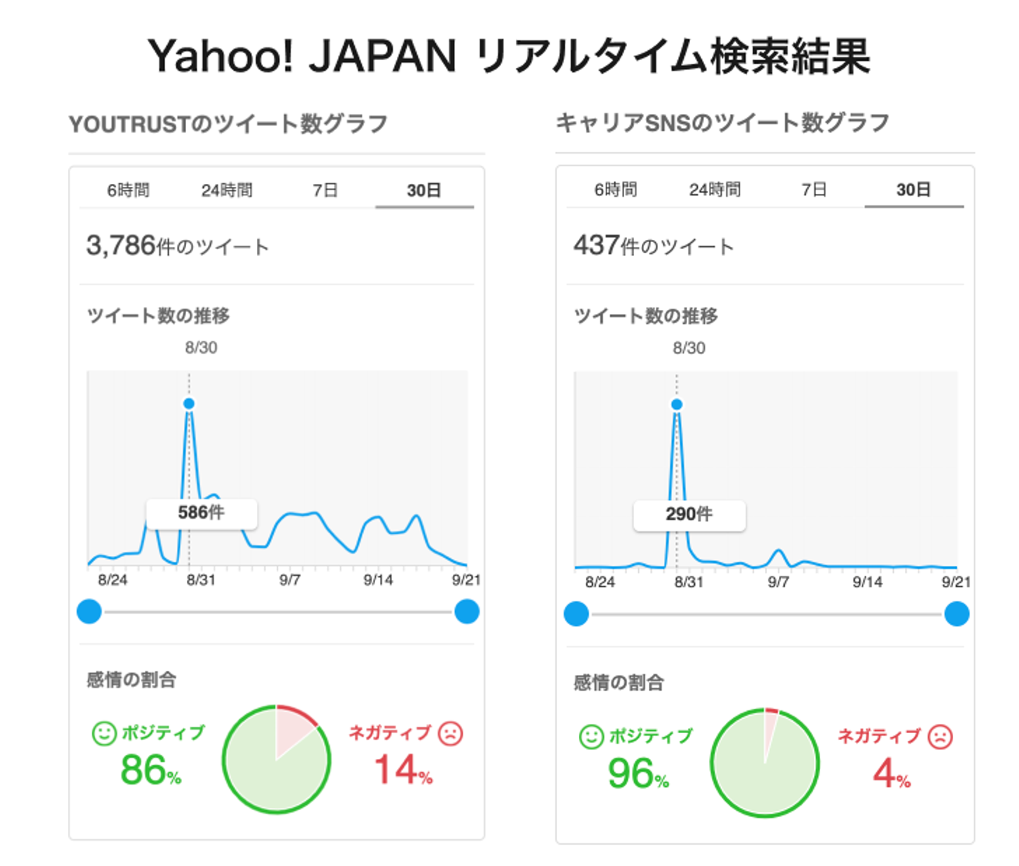 リリース当日に「YOUTRUST」で586件「キャリアSNS」で290件のツイート、ポジティブ反応が約9割