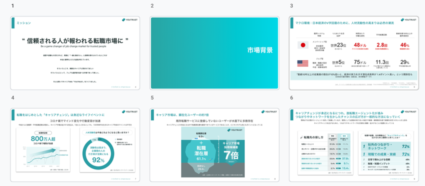 How念頭に進めていたとはいえ、ファクトに基づくWhatがないと「社会的意義」を十分に伝えきれず、一過性の盛り上がりと見られてしまう懸念がありました。なので、初めてYOUTRUSTを聞いた方、YOUTRUSTの向かう方向性を知らない方に対しても、向き合っている「日本のキャリア市場」の課題の根深さ・社会的意義・成長余地を伝えるために、マクロ情報の収集と客観的なデータを元にプレスリリース本文を作り込みました。また後述しますが、マクロ環境への共通理解を持つためにも、社内向けの情報共有を資金調達リリースまでに複数回開催しています。