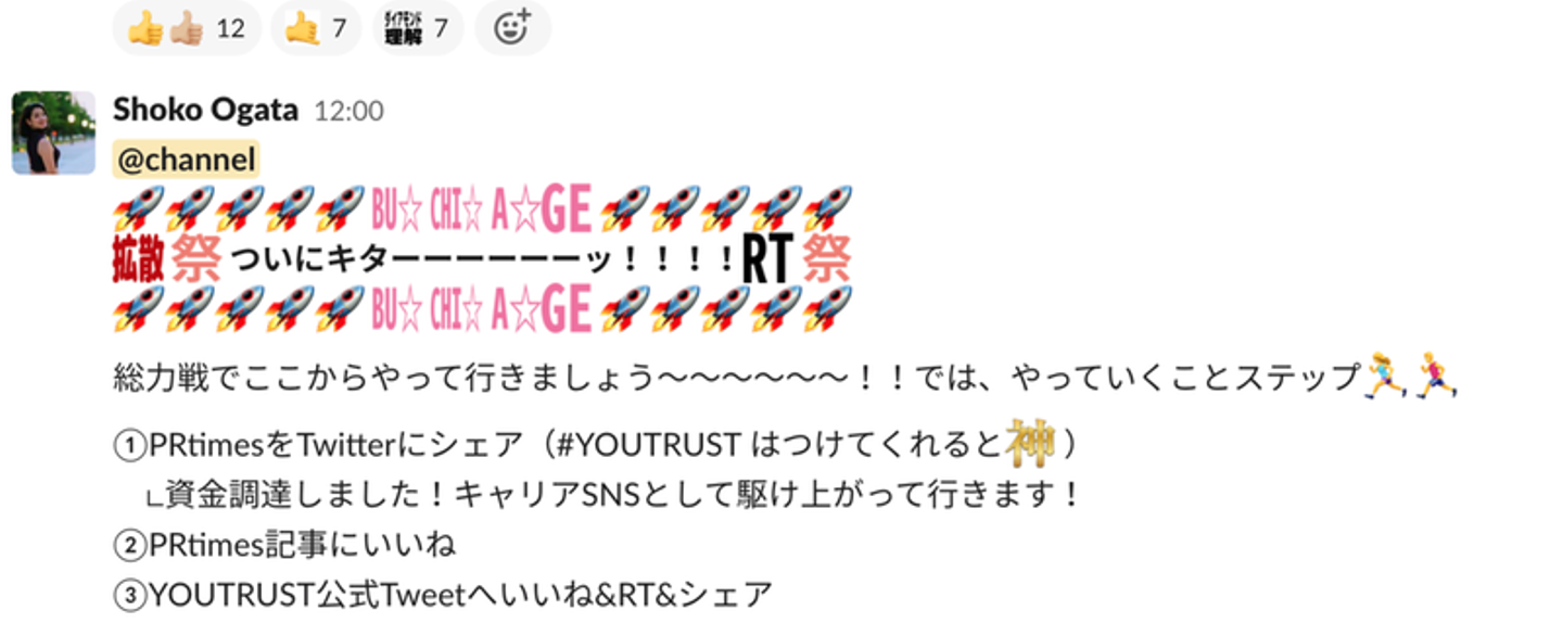 ユーザーの皆様はじめとしたYOUTRUSTに関わる皆様のおかげで、大きな波が起こせたと思っています。本当にありがとうございます。(弊社のSlackはいつもこんな感じで賑やかです笑)