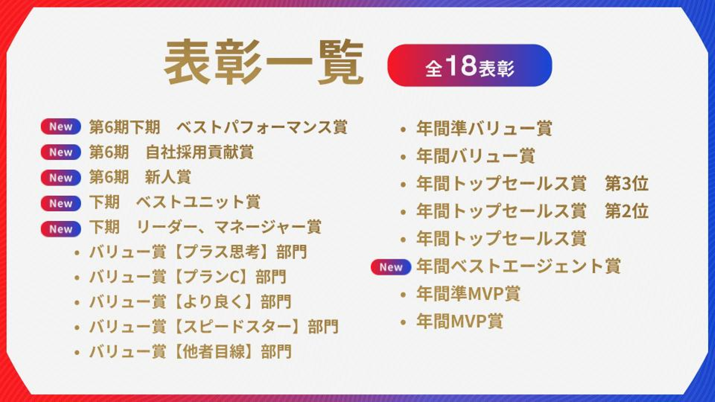 ヘイフィールドが大切にする"5バリュー"を最も体現した人に贈られる「バリュー賞」、新たなチャレンジや施策の実施など、会社全体への貢献度が高い人に贈られる「ベストパフォーマンス賞」など、営業成績などの目に見える成果だけでなく、日々の仕事の中で活躍した社員も表彰されます。