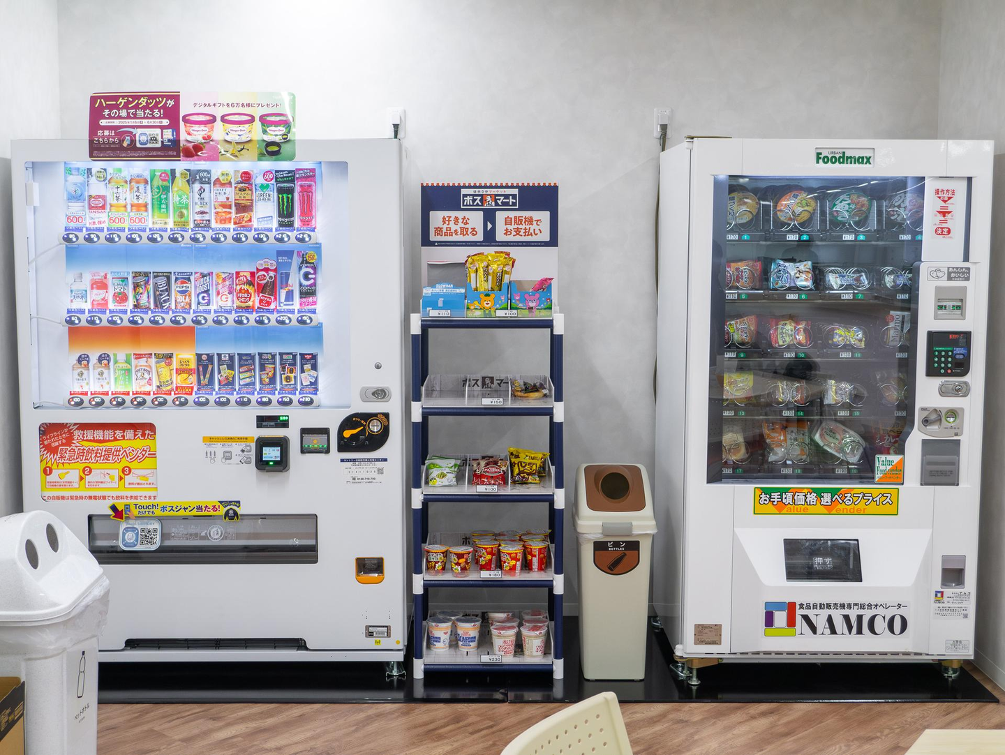 飲み物、お菓子、軽食などを購入できる自動販売機などもあるのでいつも助かっています。
