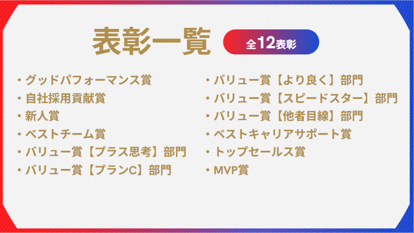 ヘイフィールドが大切にする"5バリュー"を最も体現した人に贈られる「バリュー賞」、新たなチャレンジや施策の実施など、会社全体への貢献度が高い人に贈られる「ベストパフォーマンス賞」など、営業成績などの目に見える成果だけでなく、日々の仕事の中で活躍した社員も表彰されます。
