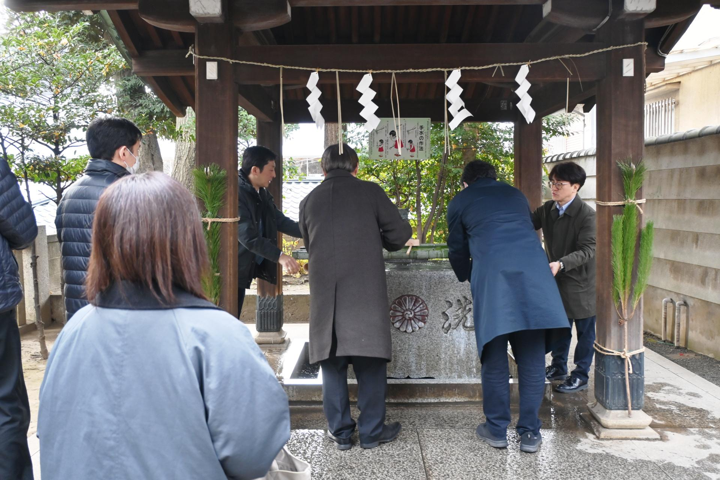 参拝前に手水舎(てみずや)で手水を使う伊藤社長とメンバー。