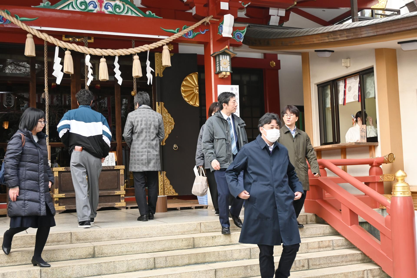 参拝を終えた一同。御札をいただきます。