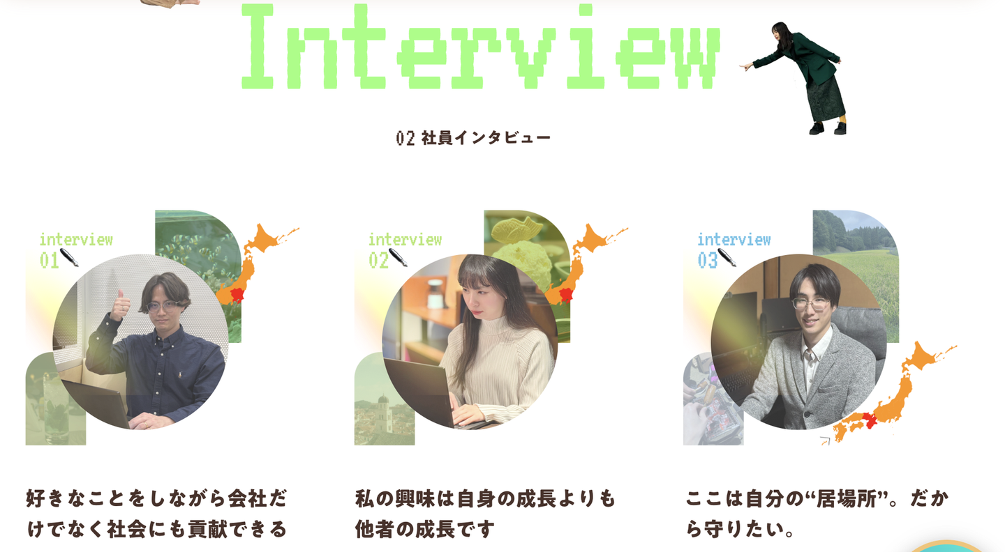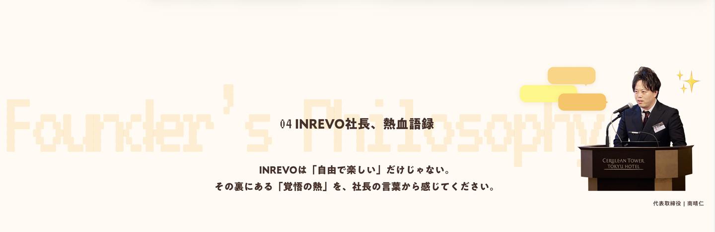 各部署の業務内容の詳細や社員インタビューに加え、社員のリアルな声でカルチャーがつかめる「3分でわかるINREVO」、代表の考え方が伝わる「社長の熱血語録」などのコンテンツも用意しました🔥!