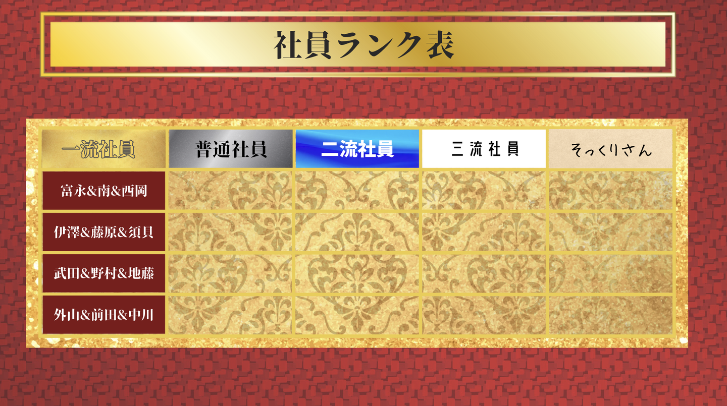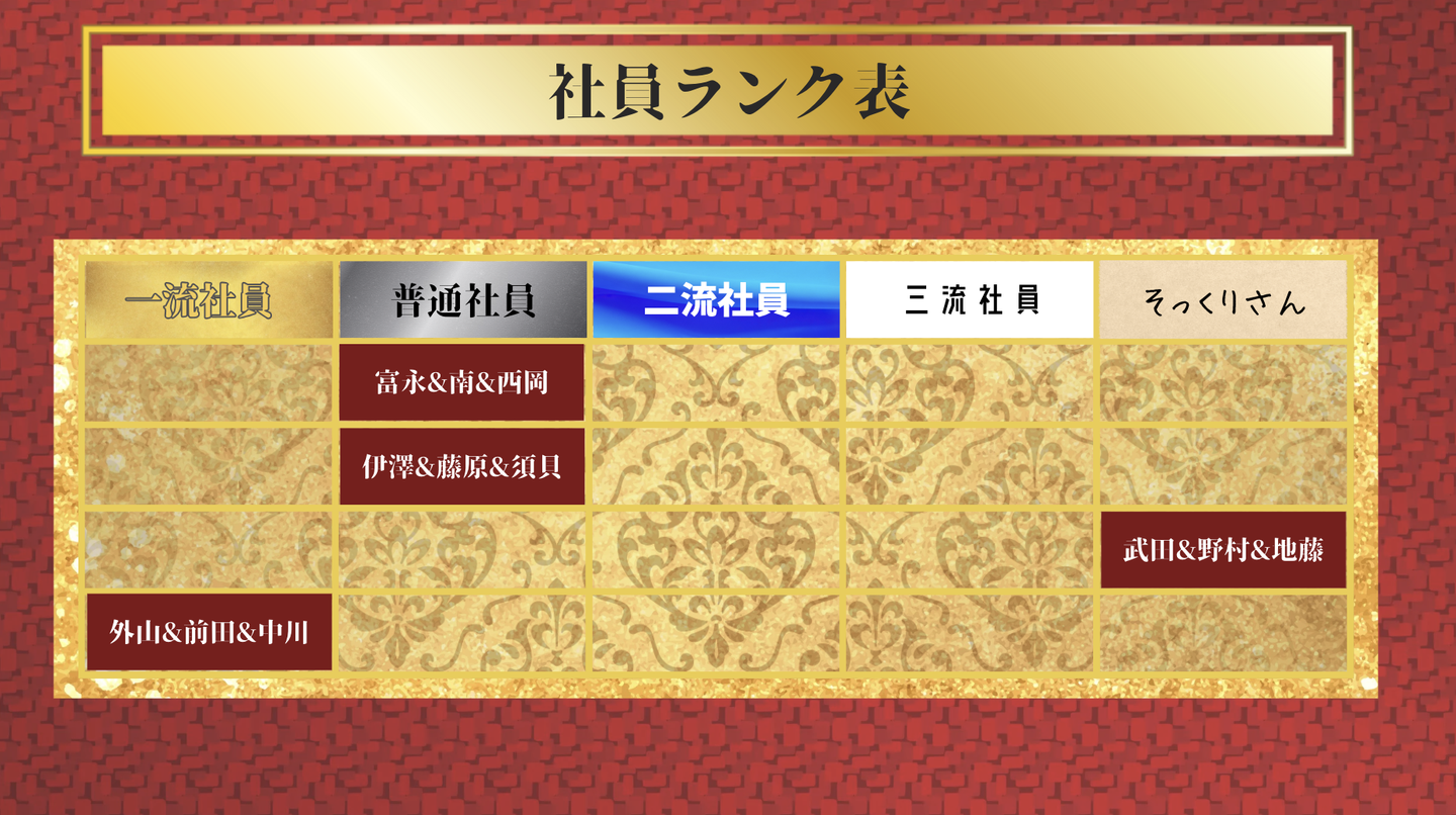 今回のイベントでは、正解するたびに「一流社員」ランクをキープし、不正解でランクダウンするというルールが適用されました。降格ランクは以下の通り。