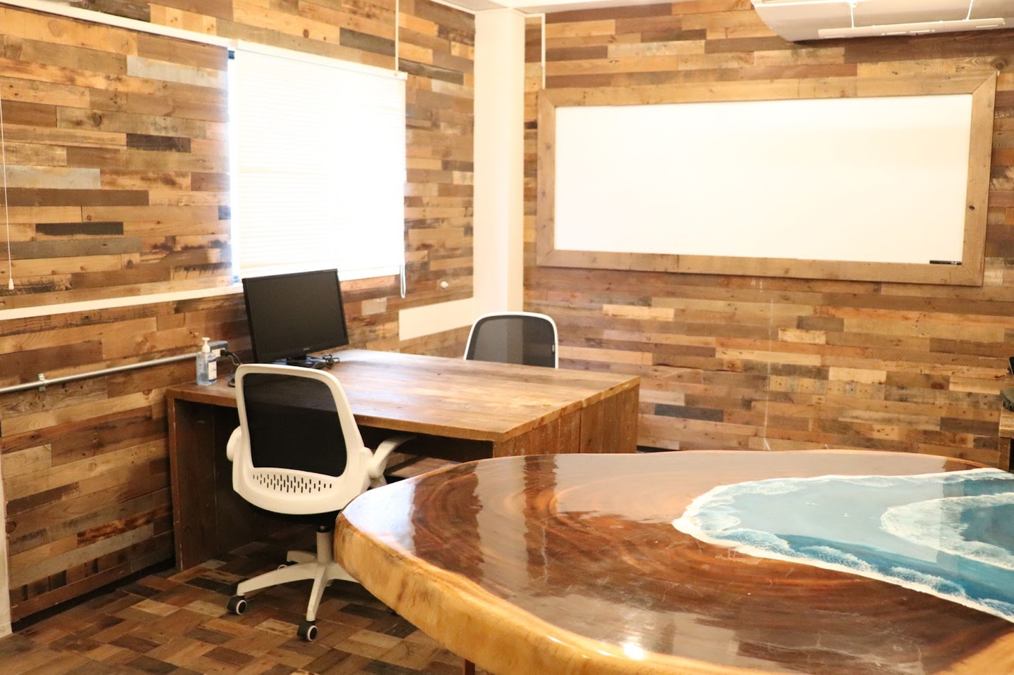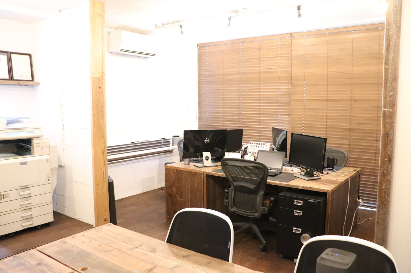 写真から分かるように、オフィス全体が木材の表情を活かした暖かみが感じられる内装になっていて、壁・床・扉・什器など全てオーダーメイドしています。