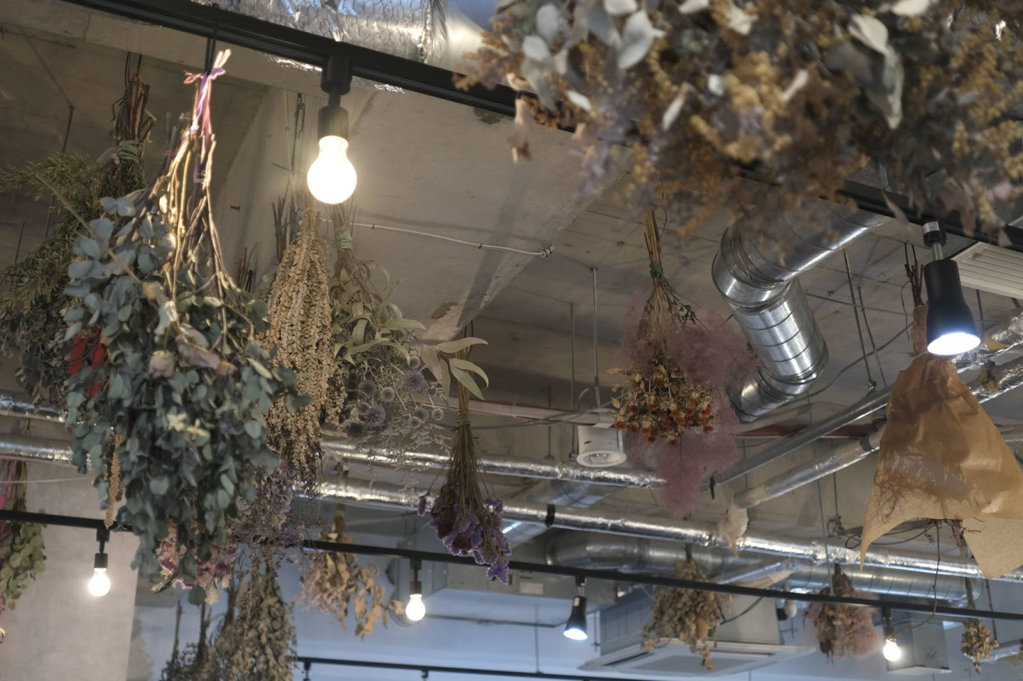 福岡オフィスは写真の通り、天井にドライフラワーがたくさんありました。