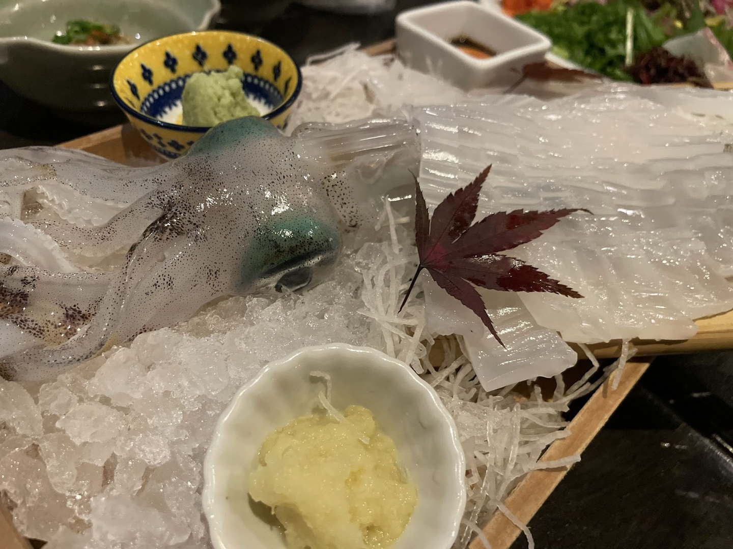 今まで食べたイカの中で一番と言って良いほど、肉厚で感動しました。イカの足はこの後炙っていただき、1匹まるっと美味しくいただきました!