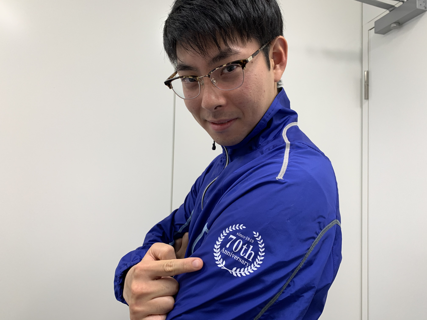 写真に写っているのは新ジャージを着て嬉しそうな新入社員の徳永さん!お客様と接するときには、いつもこんな表情で笑顔をプレゼントしています。